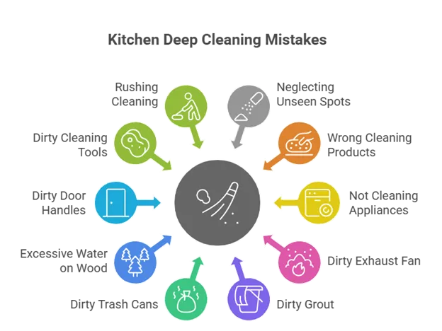 - Neglecting Unseen Spots: People typically clean what is visible, ignoring places like underneath the sink, behind the stove, or underneath the microwave vents.